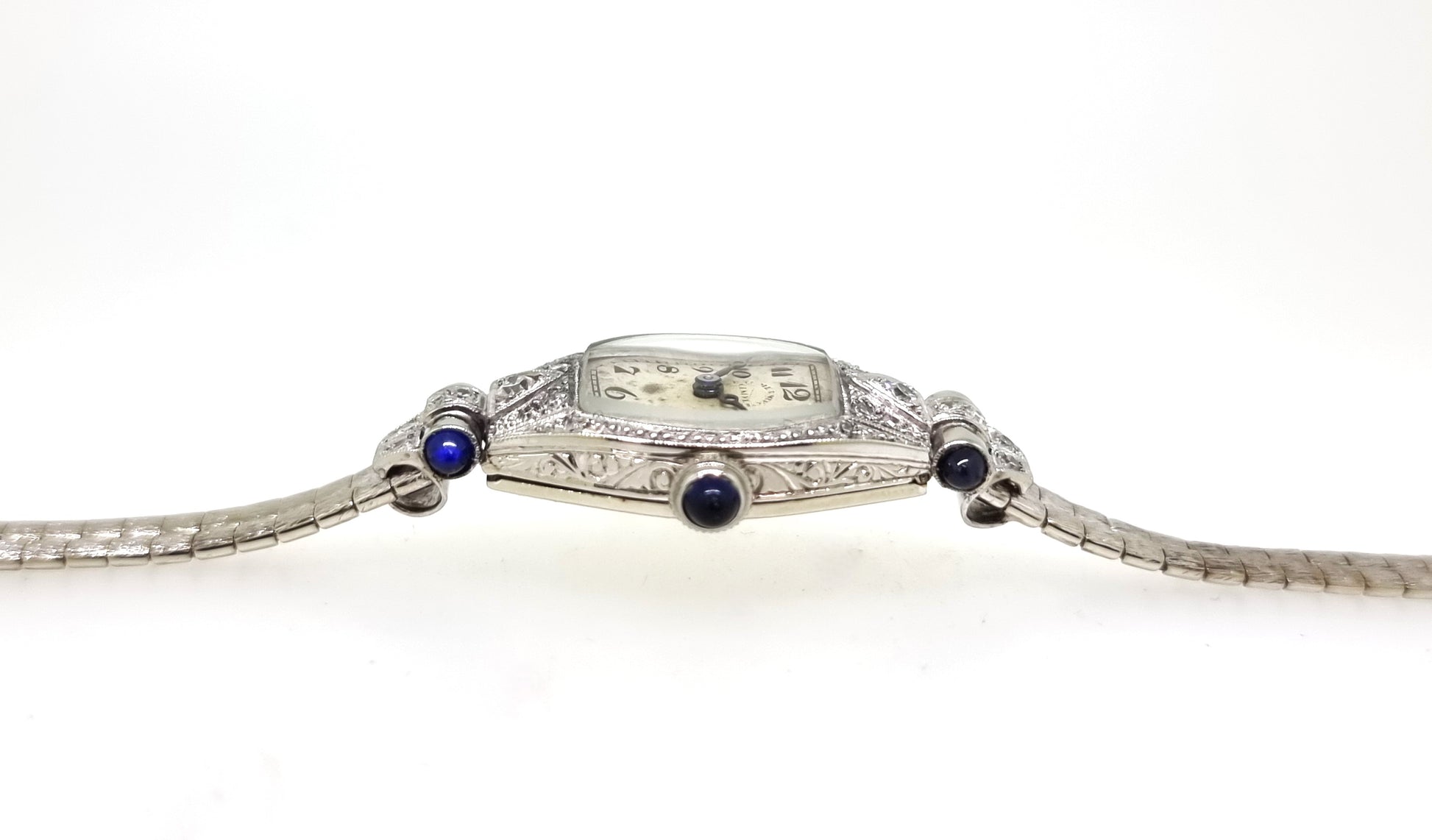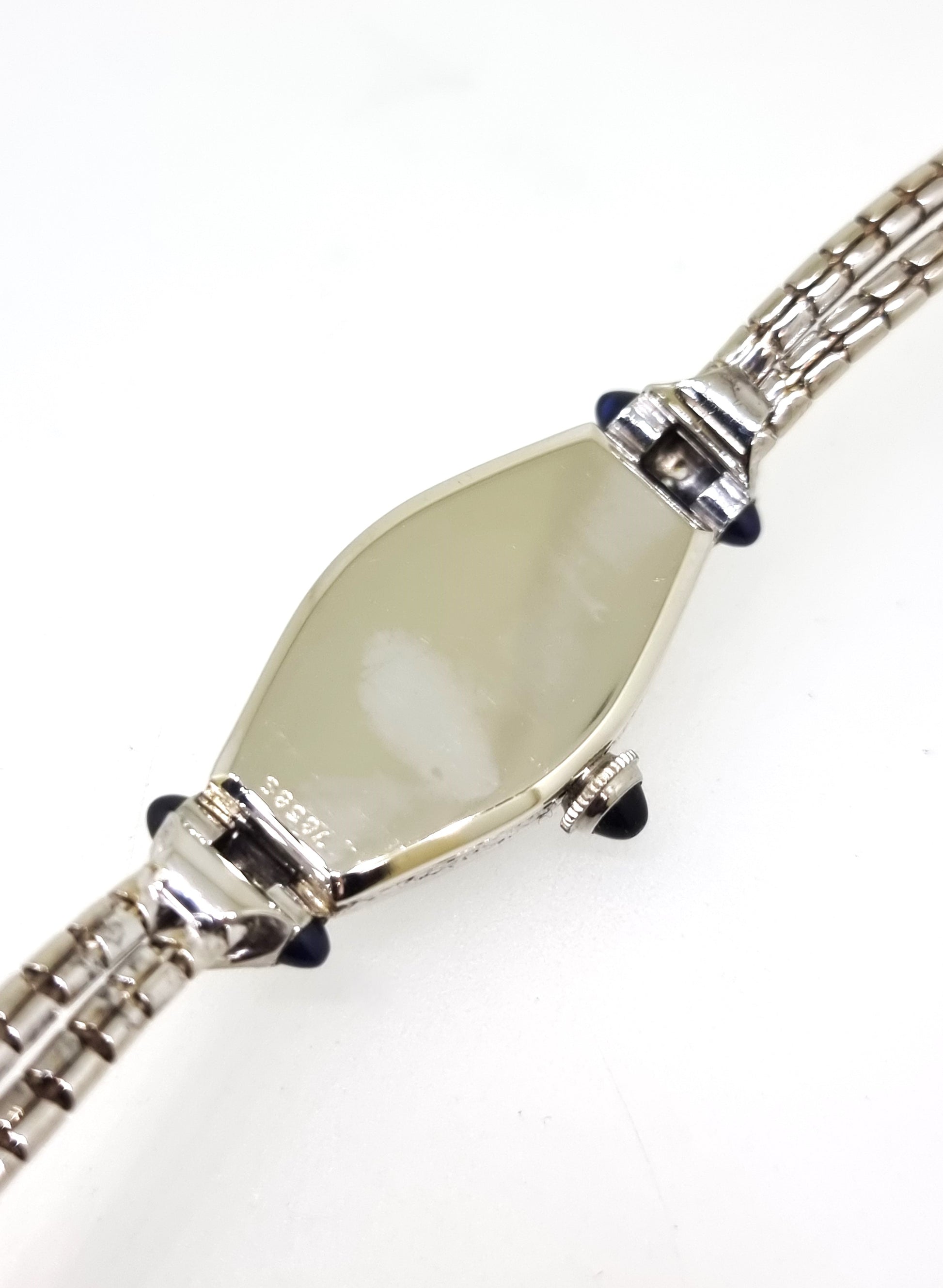 This beautiful 14mm watch features a full 18ct white gold case fitted with 22 diamonds and 5 blue cabochons.