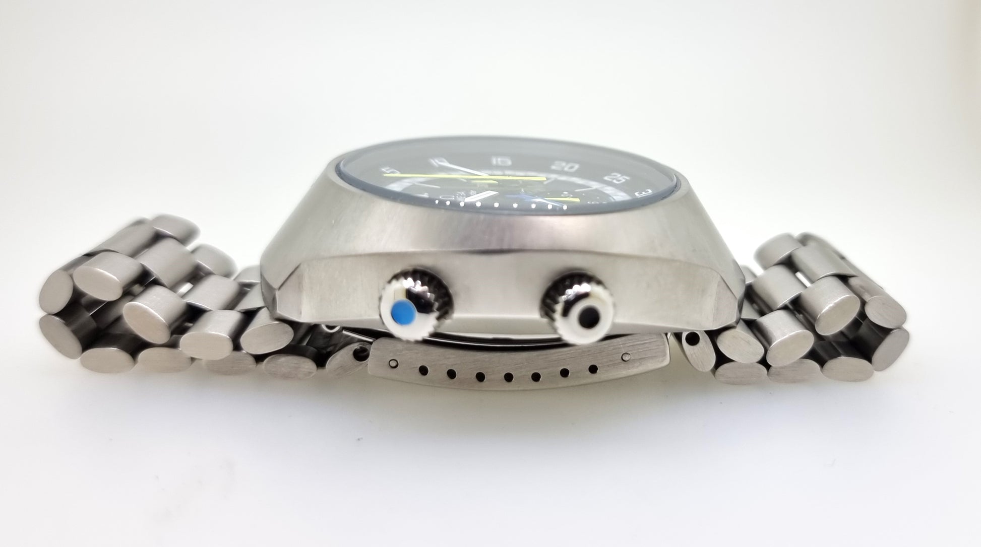 It has since undergone a complete restoration including a full movement service, several new movement parts, a new dial, new hands, new chapter ring, new crystal, new crowns, new pushers, new case tubes, new casing gaskets, and refinishing of the case and bracelet.