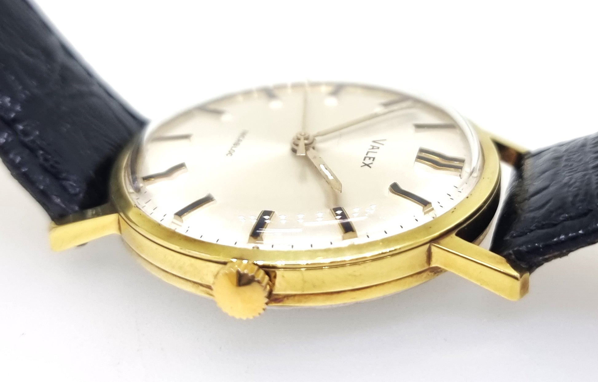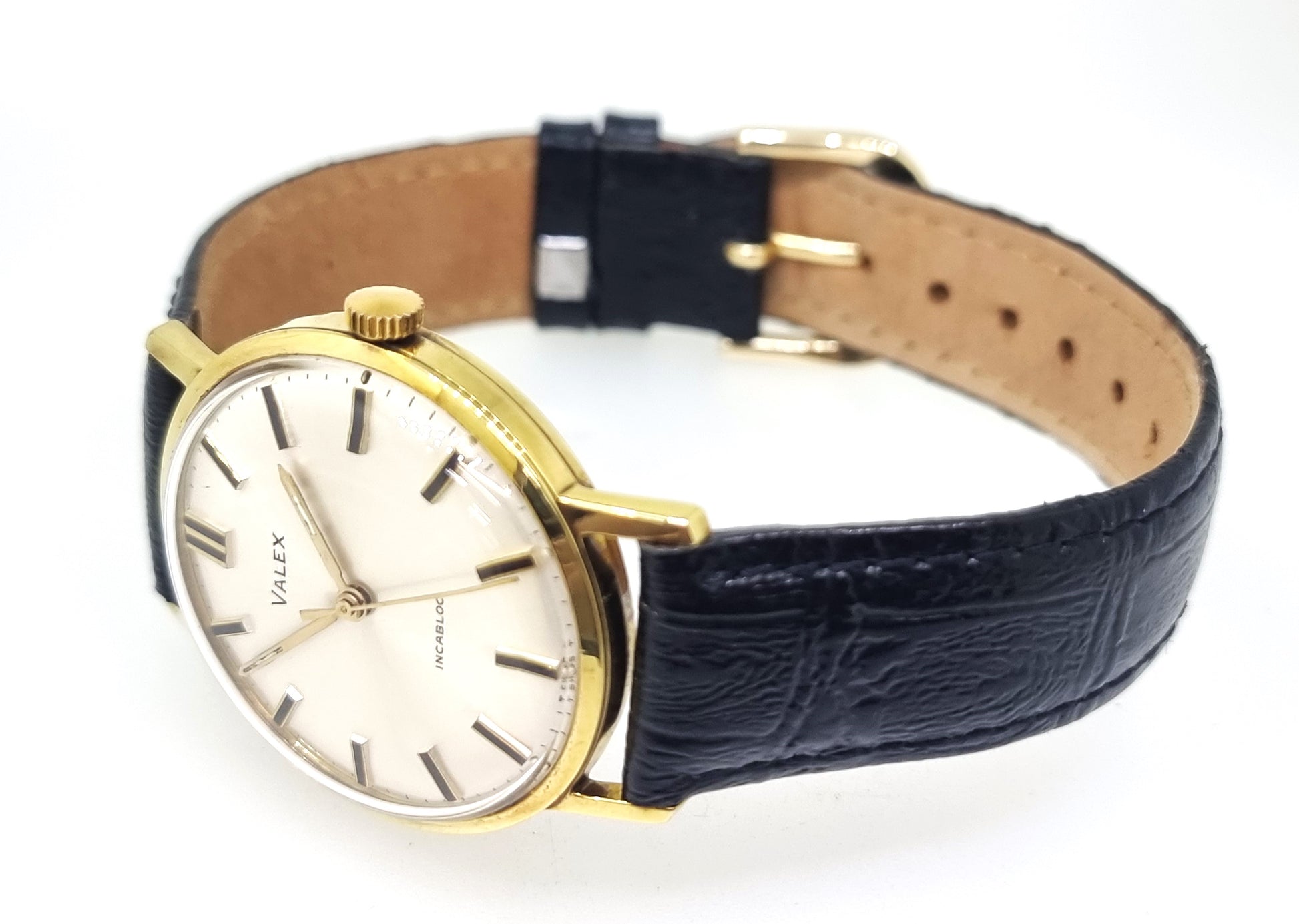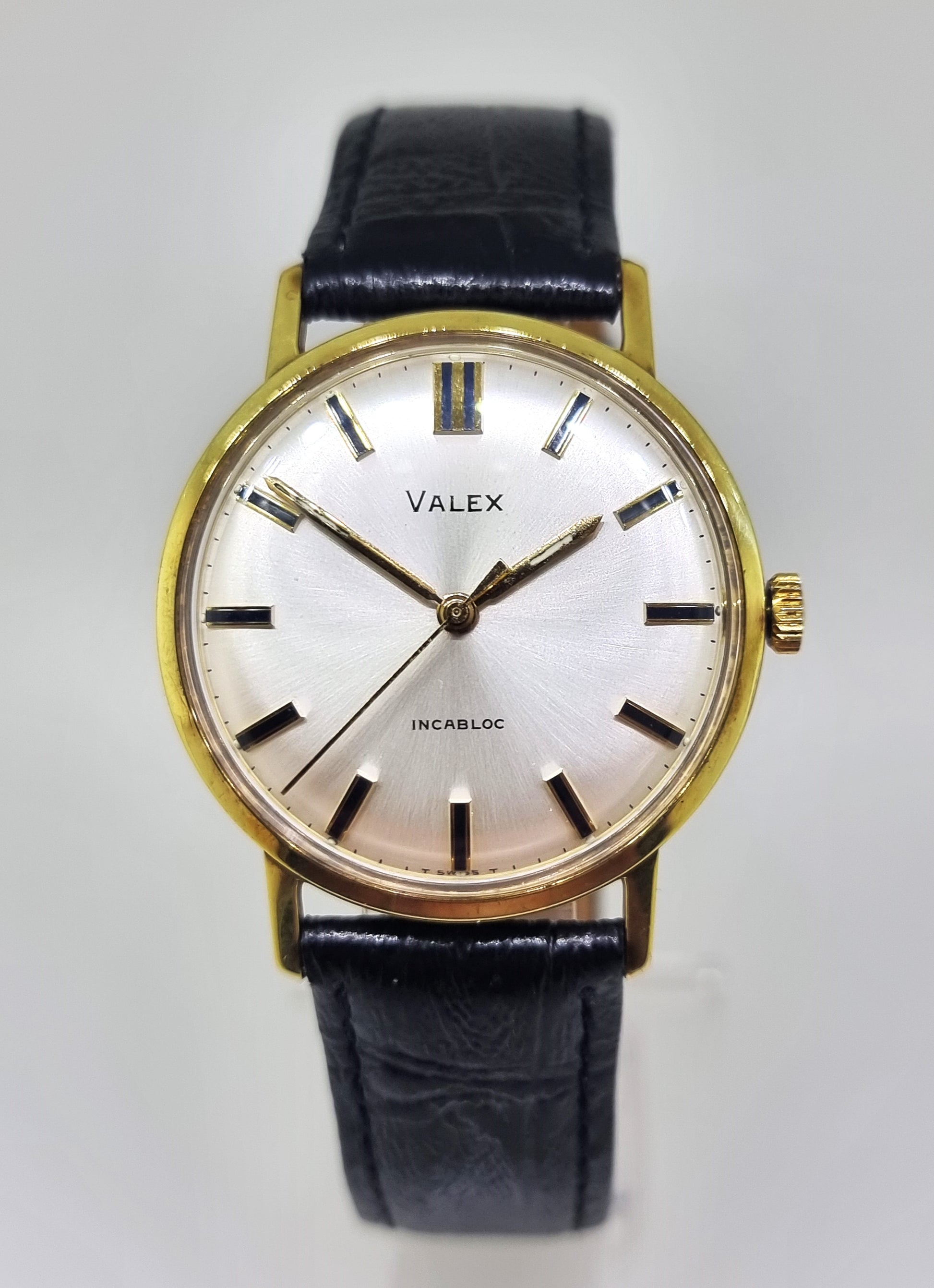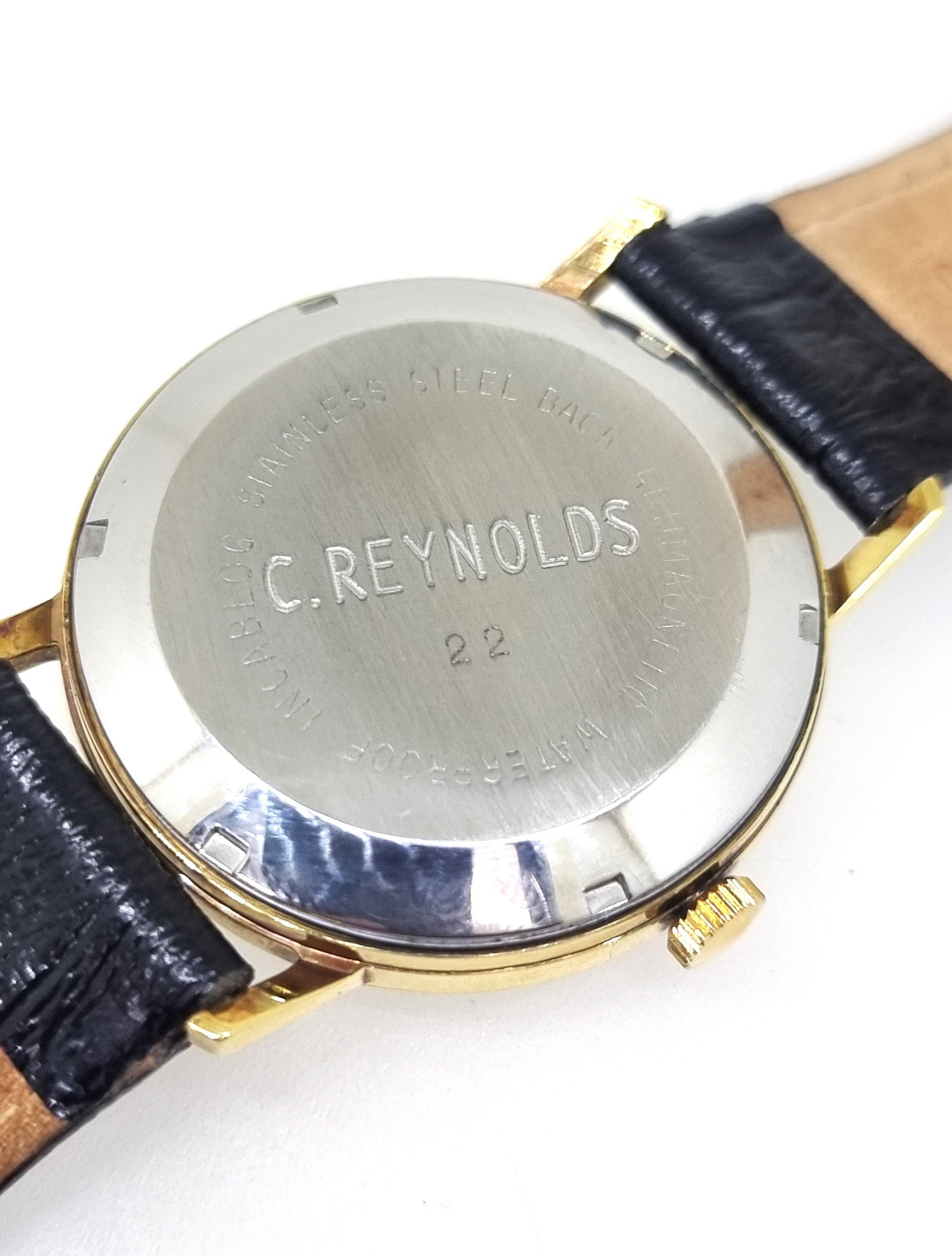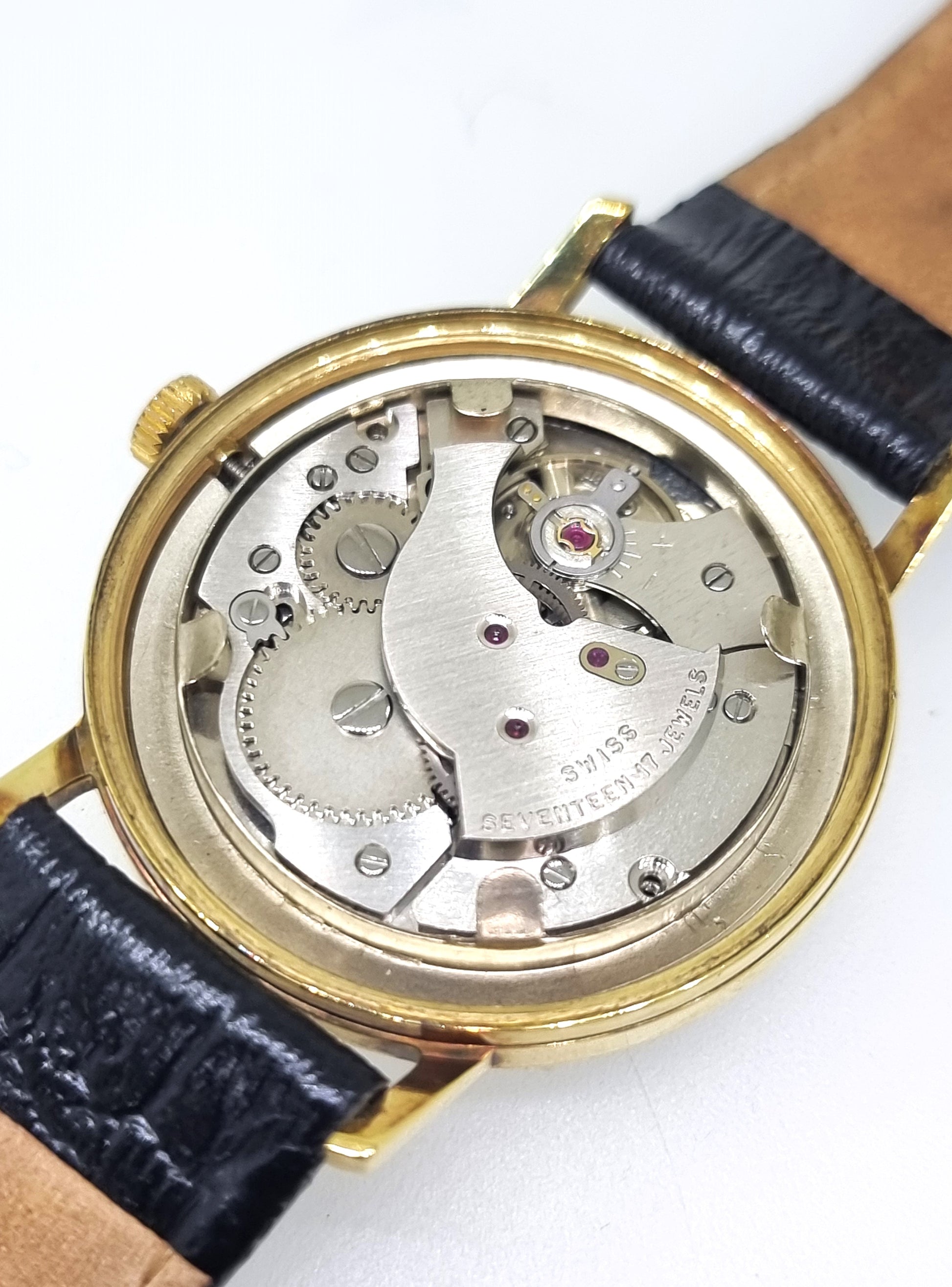 The 33.8mm case is in great condition and the gold plating has not worn through anywhere. As part of the service the watch has received, a new plexi-crystal, crown, and black leather strap have been fitted.